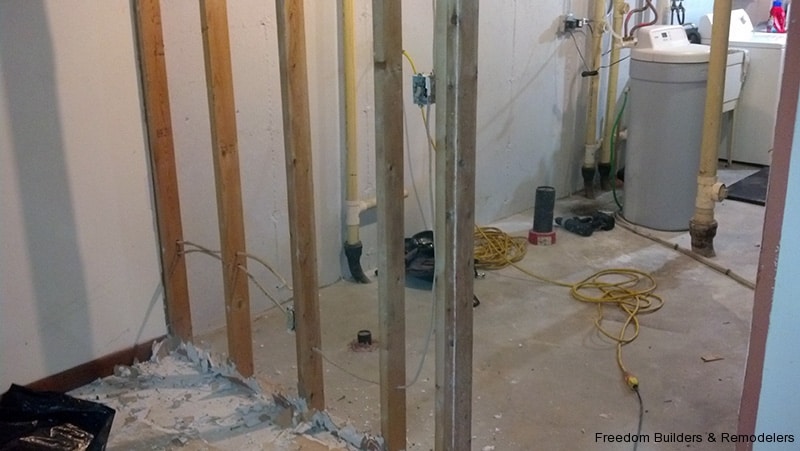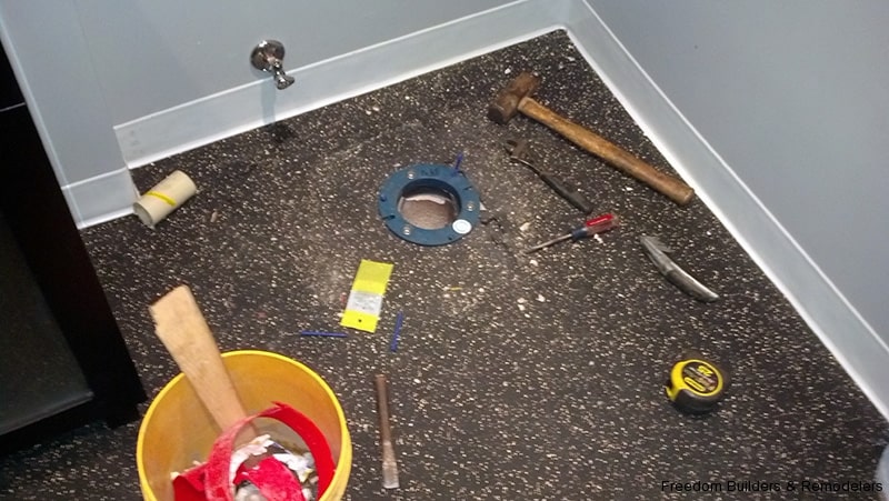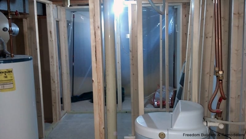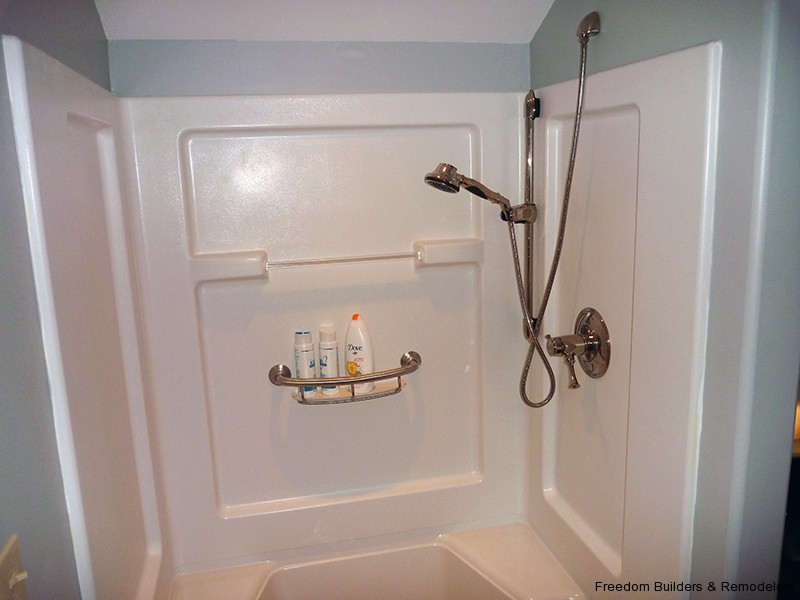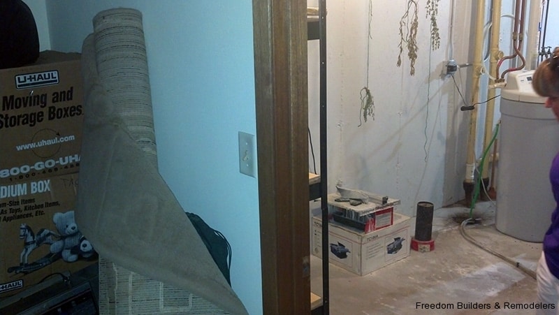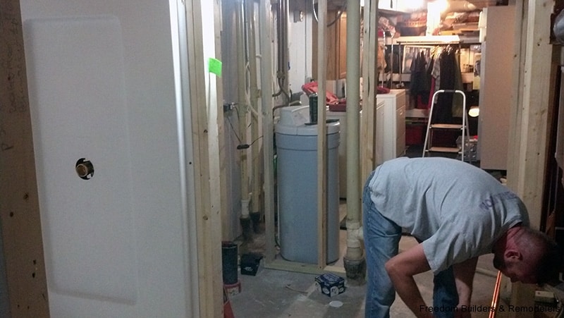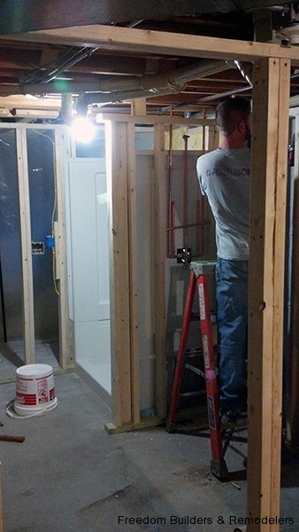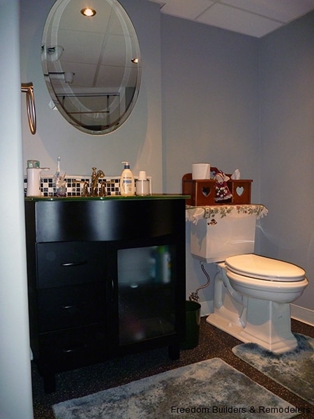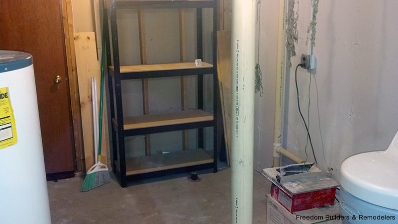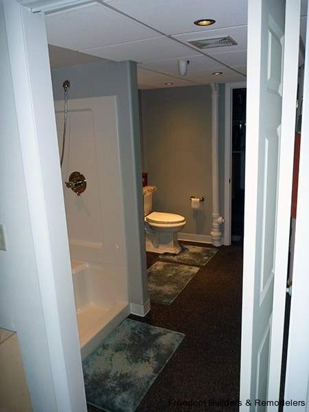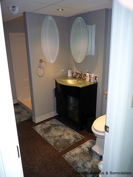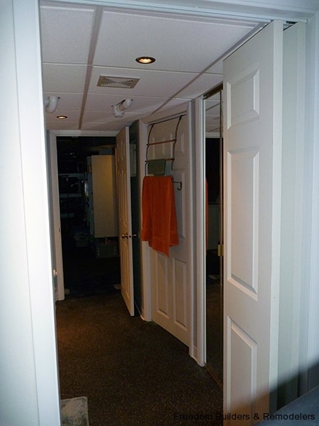 We maximized space by moving the back wall 2 feet and relocating the hot water heater. With the low ceiling height, we used a flush mount drop ceiling system. We had furred the ceiling to cover as much of the existing plumbing from the action going on upstairs. There was the kitchen and two bathrooms above this bathroom. Floor is a recycled rubber made into mats.