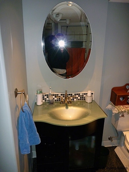 New three quarter bathroom in basement consisting of black lacquer vanity with glass door and brushed nickle fixtures. Sea foam green glass top.