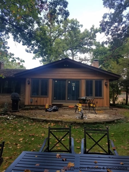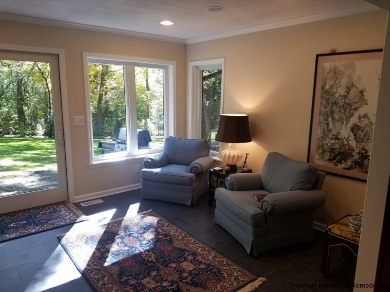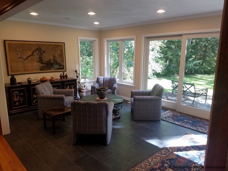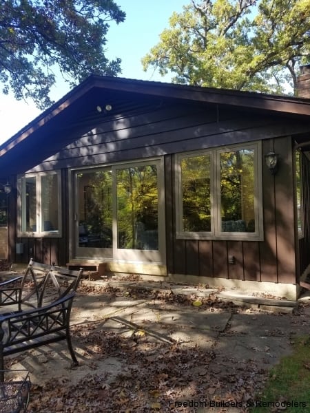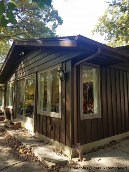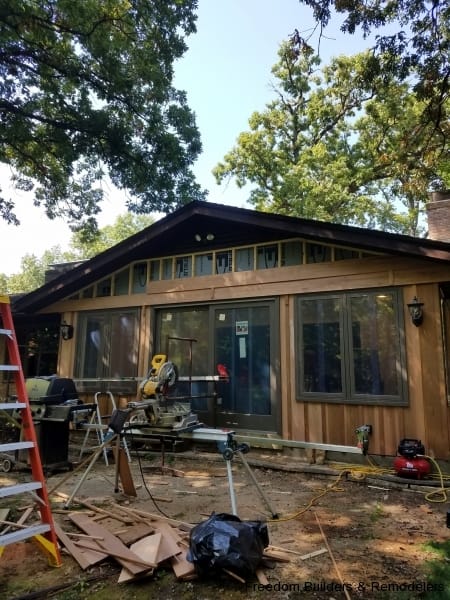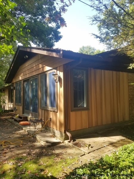 Room addition conversion we did for a client in which we had done an extensive remodel back in 2007 on the rest of their house. Exterior siding was Clear Vertical Grain Cedar. That was the best we could get to mimic Redwood that was on the rest of the house. Lower Board & Batten and 10 inch lap for the gable. A portion of the house has board & batten in the front. A lot more went on to the reconstruction than meets the eye. Such as the two 6×6 posts were found to be none structural, sleepers for raising the floor, rock-wool insulation and a whole lot more.